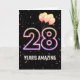 Ballons de fête et confettis sur arrière - plan noir avec le néon numéro 28 pour un 28ème anniversaire.
