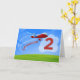 Un avion rouge est prêt à atterrir alors qu'il zoome dans le ciel au-dessus du numéro 2. Le mot petit-fils est écrit dans la courbe de l'avion volant. Ravissez votre petit-fils avec cette carte d'avion pour son 2e anniversaire !