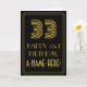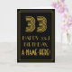 L'avant de ce style vintage et du style des années 1920-1930 s'inspirant de la carte de voeux d'anniversaire présente un grand style Art déco inspiré du numéro "33", le message "HAPPY 33rd BIRTHDAY", un nom personnalisé et un motif frontalier composé de lignes. L'intérieur comporte un message de salutation d'anniversaire modifiable, ou peut-être pourrait-il être effacé et laissé vide si un message doit être écrit à la main à la place. Une carte d'anniversaire personnalisée comme celle-ci pourrait être une façon amusante d'envoyer des voeux d'anniversaire à quelqu'un qui fête son trente-troisième anniversaire. [~Z0000394]