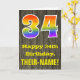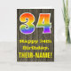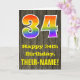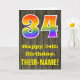 L'avant de cette conception de carte de vœux d'anniversaire colorée mais rustique comporte un grand nombre "34" ayant un motif inspiré du dégradé du spectre de l'arc-en-ciel. Il comporte également le message "Joyeux 34e anniversaire" et un nom de destinataire personnalisable. L'avant présente un fond représentant un motif d'aspect bois faux rustique. L'intérieur comporte un message de vœux d'anniversaire personnalisé, ou pourrait éventuellement être effacé et laissé vide si un message doit être écrit à la main à la place. Une carte d'anniversaire personnalisée comme celle-ci pourrait être un moyen amusant de célébrer le trente-quatrième anniversaire de quelqu'un.