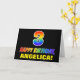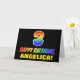 L'avant de cette carte de voeux colorée, joyeuse et amusante à thème d'anniversaire comporte un grand nombre de "3" et le message "HAPPY BANTHDAY", tous deux colorés avec un motif inspiré par un gradient de spectre arc-en-ciel, ainsi qu'un nom de destinataire personnalisé jaune gras. L'avant a aussi un arrière - plan noir clair. L'intérieur comporte un message de voeux d'anniversaire personnalisé, ou peut-être pourrait-il être effacé et laissé vide si un message doit être écrit à la main à la place. Une carte d’anniversaire personnalisable comme celle-ci pourrait être une façon amusante de reconnaître le troisième anniversaire de quelqu’un. [~Z0000472]