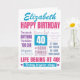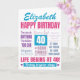 Une carte de 40ème anniversaire de typographie moderne en rose, violet et bleu. Cette carte fabuleuse peut être personnalisée avec le nom du récipiendaire du quarantième anniversaire. Il contient plusieurs citations d'anniversaire, dont "la vie commence à 40 ans" et 40 ans aimés".