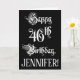 La façade de cette carte de voeux d'anniversaire fantaisie et ornée comprend le message "Joyeux 46ème anniversaire", en texte somptueux de style script, sur un arrière - plan de couleur noire. L'intérieur a un message de voeux d'anniversaire personnalisable, ou peut-être peut-être être effacé et laissé vide si un message doit être écrit à la main à la place. Une carte de voeux officielle et customisée comme celle-ci pourrait être utilisée pour souligner le quarante-sixième anniversaire de quelqu’un. [~Z0000554]
