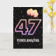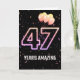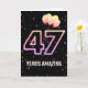 Ballons de fête et confettis sur arrière - plan noir avec le néon numéro 47 pour un 47ème anniversaire.