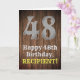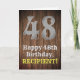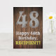 Ce style américain de l'Ancien Ouest et le look campagnard de la conception de carte de voeux d'anniversaire comprend un grand numéro d'inspiration rustique "48", le message "Happy 48th Birthday," un nom personnalisé, et un arrière - plan motif de style imitation/grain de bois. L'intérieur a un message de voeux d'anniversaire customisé, ou peut-être peut-être être effacé et laissé vide si un message doit être écrit à la main à la place. Une carte de voeux personnalisable comme celle-ci pourrait être utilisée pour célébrer le quarante-huitième anniversaire de quelqu’un. [~Z0000469]