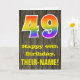 L'avant de cette conception de carte de vœux thématique d'anniversaire colorée mais rustique comporte un grand nombre "49" avec un motif inspiré du dégradé du spectre de l'arc-en-ciel, ainsi que le message "Joyeux 49e Anniversaire", et un nom de destinataire modifiable. L'arrière-plan de la face avant de la carte présente un motif d'apparence de faux grain de bois rustique. L'intérieur comporte un message de vœux d'anniversaire personnalisé, ou pourrait éventuellement être effacé et laissé vide si un message doit être écrit à la main à la place. Une carte d'anniversaire personnalisable comme celle-ci pourrait être un moyen amusant de reconnaître le quarante-neuvième anniversaire de quelqu'un. [~Z0000419]