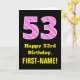 Cette carte de voeux amusante et joyeuse à thème d'anniversaire dispose d'un grand numéro "53" avec un motif rayé contenant des formes cardiaques coloré rose clair et rose foncé sur l'avant. Le recto contient également le message de voeux d'anniversaire "Joyeux 53e anniversaire", ainsi qu'un nom de destinataire personnalisable. L'intérieur comporte un message de voeux d'anniversaire modifiable, ou peut-être pourrait-il être effacé et laissé vide si un message doit être écrit à la main à la place. Une carte d'anniversaire comme celle-ci pourrait être une façon amusante d'envoyer des voeux d'anniversaire à quelqu'un qui célèbre son cinquante-troisième anniversaire. Cela pourrait aussi être un choix amusant pour quelqu'un dont l'anniversaire tombe le 14 février (Saint-Valentin), en raison de ses symboles et couleurs de coeur affectueux. [~Z0000434]