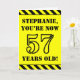 Le devant de cette carte de voeux amusante et attirant l’attention sur le thème de l’anniversaire comporte un nom personnalisé et le message "VOUS AVEZ MAINTENANT 57 ANS !" en texte noir inspiré par un pochoir sur un arrière - plan de couleur jaune. L'avant est également orné d'un motif rayé noir et jaune accrocheur aux bords supérieur et inférieur. L'intérieur comporte un message de voeux d'anniversaire personnalisable, ou peut-être pourrait-il être effacé et laissé vide si un message doit être écrit à la main à la place. Une carte d'anniversaire personnalisée comme celle-ci pourrait être une façon amusante d'envoyer des voeux d'anniversaire à quelqu'un qui célèbre son cinquante-septième anniversaire. [~Z0000413]