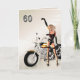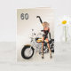 60ème anniversaire avec une moto. Une fille debout à côté d'une moto montrant le message Joyeux anniversaire. La fille porte des talons et une basque. Elle est grande, mince et blonde. Une grande carte pour l'homme qui aime ses vélos !