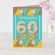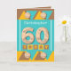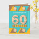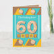 Carte de voeux 60e anniversaire. 60 aujourd'hui, ajoutez un nom et écrivez votre message à l'intérieur. Turquoise et brune, jaune avec des formes casquettes et triangles de bouteille. Joyeux anniversaire.