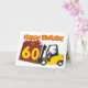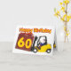 Un chariot élévateur à fourche tient un colis avec l'âge sur lui en lettres jaune vif. Une carte d'anniversaire joyeuse et drôle pour un homme.