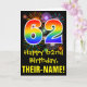 L'avant de cette carte de voeux d'anniversaire passionnante, colorée et amusante comprend un grand nombre de "62" ayant un motif inspiré par un gradient de spectre arc-en-ciel. Il contient également le message "Happy 62nd Birthday," et un nom de destinataire modifiable. La façade est également ornée d'un motif arrière - plan coloré inspiré par l'aspect d'un feu d'artifice festif éclatant. L'intérieur comporte un message de voeux d'anniversaire modifiable, ou peut-être pourrait-il être effacé et laissé vide si un message doit être écrit à la main à la place. Une carte d'anniversaire comme celle-ci pourrait être une façon amusante d'envoyer des voeux d'anniversaire à quelqu'un qui célèbre son soixante-deuxième anniversaire. [~Z0000442]