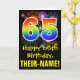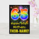 La façade de cette carte de voeux amusante, colorée et passionnante sur le thème de l'anniversaire comporte un grand nombre de "65" avec un motif inspiré par un gradient de spectre arc-en-ciel, ainsi que le message "Happy 65th Birthday", et un nom de destinataire personnalisé. La façade est également ornée d'un motif arrière - plan coloré inspiré par l'explosion des feux d'artifice festifs. L'intérieur comporte un message de salutation d'anniversaire personnalisé, ou peut-être pourrait-il être effacé et laissé vide si un message doit être écrit à la main à la place. Une carte d’anniversaire personnalisable comme celle-ci pourrait être une façon amusante de reconnaître le soixante-cinquième anniversaire de quelqu’un. [~Z0000442]