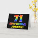 L'avant de cette carte de voeux joyeuse, colorée et amusante à thème d'anniversaire comporte un grand numéro "71" et le message "HAPPY BANTHDAY", tous deux colorés avec un motif inspiré par un gradient de spectre arc-en-ciel, ainsi qu'un nom de destinataire modifiable jaune en gras. L'avant est également orné d'un arrière - plan simple, clair et noir. L'intérieur a un message de voeux d'anniversaire personnalisable, ou peut-être peut-être être effacé et laissé vide si un message doit être écrit à la main à la place. Une carte d’anniversaire personnalisée comme celle-ci pourrait être une façon amusante de célébrer le soixante-et-onzième anniversaire de quelqu’un. [~Z0000472]