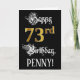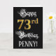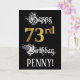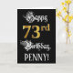 Le recto de cette carte de voeux opulente et élaborée à thème d'anniversaire comporte le message "Joyeux 73e anniversaire", ainsi qu'un nom de destinataire personnalisé. Une partie du message est dans un texte orné de style script, le grand numéro "73ème" dispose d'un faux/imitation motif de look d'inspiration or, et l'arrière - plan est coloré en noir. L'intérieur a un message de voeux d'anniversaire personnalisable, ou peut-être peut-être être effacé et laissé vide si un message doit être écrit à la main à la place. Une carte de voeux élégante et customisée comme celle-ci pourrait être envoyée pour célébrer le soixante-treize anniversaire de quelqu’un. [~Z0000559]