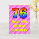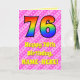 L'avant de cette carte de voeux amusante et joyeuse à 76ème anniversaire avec un grand nombre de "76" avec un motif coloré du spectre arc-en-ciel inspiré de dégradé. Il comporte également le message "Joyeux 76e anniversaire", ainsi qu'un nom de destinataire personnalisé. L'arrière - plan de l'avant est doté d'un motif rayé rose clair et rose foncé, aux coeurs roses aimés. L'intérieur comporte un message de voeux d'anniversaire personnalisé, ou peut-être pourrait-il être effacé et laissé vide si un message doit être écrit à la main à la place. Une carte d'anniversaire personnalisable comme celle-ci pourrait être une façon amusante d'envoyer des voeux d'anniversaire à quelqu'un qui célèbre son soixante-seizième anniversaire. [~Z0000416]