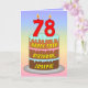 Cette carte de voeux d'anniversaire colorée et joyeuse présente une représentation de type dessin animé d'un gâteau d'anniversaire à trois niveaux avec des bougies en forme de chiffre sur le dessus montrant l'âge "78", avec le message "HAPPY 78TH BIRTHDAY", et un nom de destinataire modifiable. L'arrière - plan de l'avant dispose d'un motif multicolore pastel en arc-en-ciel inspiré du spectre dégradé. L'intérieur a un message de voeux d'anniversaire personnalisé, ou peut-être peut-être être effacé et laissé vide si un message doit être écrit à la main à la place. Une carte de voeux d'anniversaire joyeuse et customisée comme celle-ci pourrait être une façon amusante de transmettre des voeux d'anniversaire à quelqu'un qui célèbre son soixante-dix-huitième anniversaire. [~Z0000625]