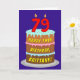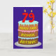 Cette carte de voeux joyeuse et joyeuse à thème d'anniversaire présente une représentation d'un gâteau d'anniversaire à trois niveaux avec des bougies en forme de numéro sur le dessus montrant l'âge "79", avec le message "HAPPY 79TH BANTHDAY", et un nom de destinataire personnalisé. L'intérieur a un message de voeux d'anniversaire customisé, ou peut-être peut-être être effacé et laissé vide si un message doit être écrit à la main à la place. Une carte de voeux d’anniversaire optimiste et personnalisée comme celle-ci pourrait être utilisée pour souligner le soixante-dix-neuvième anniversaire de quelqu’un. [~Z0000620]