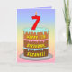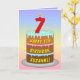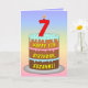 Cette carte de voeux joyeuse et amusante à thème d'anniversaire présente une représentation de dessin animé d'un gâteau d'anniversaire à trois niveaux avec une bougie en forme de numéro sur le dessus montrant l'âge "7", avec le message "HAPPY 7TH BIRTHDAY," et un nom de destinataire personnalisé. L'arrière - plan de l'avant dispose d'un motif multicolore pastel en arc-en-ciel inspiré du spectre dégradé. L'intérieur comporte un message de voeux d'anniversaire customisé, ou peut-être pourrait-il être effacé et laissé vide si un message doit être écrit à la main à la place. Une carte de voeux d’anniversaire colorée et personnalisable comme celle-ci pourrait être envoyée pour célébrer le septième anniversaire de quelqu’un. [~Z0000625]