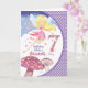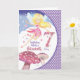 Pour une petite fille de 7 ans. Cette jolie carte d'anniversaire présente une jolie petite fée en robe rose survolant deux champignons décoratifs. Elle a de longs cheveux jaunes et porte une petite étoile. Dans l'arrière - plan sont des nuages blancs moelleux, et sur son côté droit est une bordure de petites marguerites blanches sur un arrière - plan lilas.