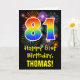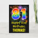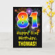 La façade de cette carte de voeux passionnante, colorée et amusante à thème d'anniversaire comporte un grand nombre de "81" ayant un motif inspiré par un gradient de spectre arc-en-ciel. Il contient également le message "Joyeux 81e anniversaire" et un nom de destinataire modifiable. Le devant a en outre un motif arrière - plan coloré inspiré par l'apparition de feux d'artifice festifs éclatants. L'intérieur comporte un message de salutation d'anniversaire personnalisé, ou peut-être pourrait-il être effacé et laissé vide si un message doit être écrit à la main à la place. Une carte d’anniversaire personnalisée comme celle-ci pourrait être une façon amusante d’envoyer un message célébrant le quatre-vingt-unième anniversaire de quelqu’un. [~Z0000442]