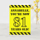 L’avant de cette carte de voeux amusante et attrayante, sur le thème de l’anniversaire, comporte un nom personnalisable et le message "VOUS AVEZ MAINTENANT 81 ANS !" en texte de style pochoir noir sur un arrière - plan de couleur jaune. Il y a aussi un motif rayé jaune et noir accrocheur aux bords supérieur et inférieur de l'avant. L'intérieur comporte un message de voeux d'anniversaire personnalisable, ou peut-être pourrait-il être effacé et laissé vide si un message doit être écrit à la main à la place. Une carte d'anniversaire personnalisée comme celle-ci pourrait être une façon amusante d'envoyer des voeux d'anniversaire à quelqu'un qui célèbre son quatre-vingts premier anniversaire. [~Z0000413]