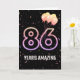 Ballons de fête et confettis sur arrière - plan noir avec le néon numéro 86 pour un 86ème anniversaire.