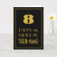 Cette conception de carte de voeux d'anniversaire inspirée et vintage/rétro de l'époque des années 20 Roaring présente un grand style art déco inspiré du numéro "8", le message "HAPPY 8th BIRTHDAY", un nom personnalisable, et un motif de bordure composé de lignes fines sur le devant. L'avant a un arrière - plan noir. L'intérieur a un message d'anniversaire personnalisé, ou peut-être peut-être être effacé et laissé vide si un message doit être écrit à la main à la place. Une carte de voeux d’anniversaire personnalisée comme celle-ci pourrait être envoyée pour célébrer le huitième anniversaire de quelqu’un. [~Z0000499]