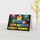 L'avant de cette carte de voeux d'anniversaire colorée, joyeuse et amusante comporte un grand nombre de "8" et le message "HAPPY BANTHDAY", tous deux colorés avec un motif inspiré par un gradient de spectre arc-en-ciel, ainsi qu'un nom de destinataire personnalisé jaune gras. Le front a également un motif arrière - plan multicolore inspiré par l'aspect de feux d'artifice festifs éclatants. L'intérieur comporte un message de voeux d'anniversaire modifiable, ou peut-être pourrait-il être effacé et laissé vide si un message doit être écrit à la main à la place. Une carte d’anniversaire personnalisable comme celle-ci pourrait être une façon amusante de célébrer le huitième anniversaire de quelqu’un. [~Z0000471]