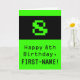 L'avant de cette carte de voeux amusante et nerveuse à thème d'anniversaire dispose d'un grand jeu vidéo classique vert style "8". Il comporte également le message de voeux d'anniversaire "Happy 8th Birthday," et un nom personnalisé. L'intérieur comporte un message d'anniversaire personnalisé, ou pourrait être effacé et laissé vide si un message doit être écrit à la main à la place. Une carte d'anniversaire geek comme celle-ci pourrait être une façon amusante d'envoyer des voeux d'anniversaire à quelqu'un qui célèbre son huitième anniversaire. [~Z0000430]