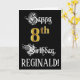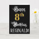 La façade de cette carte de voeux d'anniversaire luxueuse et élégante comporte le message "Happy 8th Birthday", ainsi qu'un nom de destinataire personnalisable. Une partie du message est dans un texte de style script sophistiqué, le grand numéro "8th" présente un faux/imitation motif d'apparence d'inspiration or, et l'arrière - plan est de couleur noire. L'intérieur a un message de voeux d'anniversaire personnalisable, ou peut-être peut-être être effacé et laissé vide si un message doit être écrit à la main à la place. Une carte de voeux officielle et customisée comme celle-ci pourrait être envoyée pour célébrer le huitième anniversaire de quelqu’un. [~Z0000559]