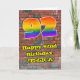 Ce dessin animé urbain et animé sur le thème du graffiti et de la carte de voeux d'anniversaire comporte un grand nombre de "92" avec un dégradé coloré de l'arc-en-ciel inspiré motif, avec le message "Happy 92nd Birthday," et un nom personnalisé. L'arrière - plan de l'avant a un motif mural en brique. L'intérieur a un message de voeux d'anniversaire personnalisable, ou peut-être peut-être être effacé et laissé vide si un message doit être écrit à la main à la place. Une carte de voeux d'anniversaire dynamique et customisée comme celle-ci pourrait être une façon amusante d'envoyer des voeux d'anniversaire à quelqu'un qui célèbre son quatre-vingt-douzième anniversaire. [~Z0000586]
