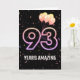 Ballons de fête et confettis sur arrière - plan noir avec le néon numéro 93 pour un 93ème anniversaire.