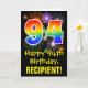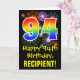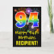 La façade de cette carte de voeux colorée, amusante et passionnante à thème d'anniversaire comporte un grand nombre de "94" avec un motif inspiré par un gradient de spectre arc-en-ciel, ainsi que le message "Happy 94th Birthday", et un nom de destinataire personnalisé. Le front a en outre un motif arrière - plan coloré inspiré par l'aspect d'un feu d'artifice festif éclatant. L'intérieur comporte un message de voeux d'anniversaire customisé, ou peut-être pourrait-il être effacé et laissé vide si un message doit être écrit à la main à la place. Une carte d’anniversaire personnalisée comme celle-ci pourrait être une façon amusante d’envoyer un message pour célébrer le quatre-vingt-quatorzième anniversaire de quelqu’un. [~Z0000442]