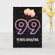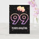 Ballons de fête et confettis sur arrière - plan noir avec le néon numéro 99 pour un 99ème anniversaire.