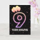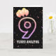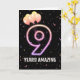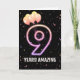 Ballons de fête et confettis sur arrière - plan noir avec le néon numéro 9 pour un 9ème anniversaire.