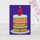 La façade de cette carte de voeux d'anniversaire amusante et joyeuse présente une représentation d'un gâteau d'anniversaire à trois niveaux avec une bougie en forme de numéro sur le dessus montrant l'âge "9", avec le message "HAPPY 9TH BIRTHDAY," et un nom de destinataire personnalisé. L'intérieur a un message de voeux d'anniversaire personnalisé, ou peut-être peut-être être effacé et laissé vide si un message doit être écrit à la main à la place. Une carte de voeux d'anniversaire optimiste et customisée comme celle-ci pourrait être une façon amusante de transmettre un message d'anniversaire à quelqu'un qui célèbre son neuvième anniversaire. [~Z0000620]