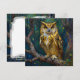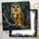 A beautiful blank card with a gold and blue owl sitting on a tree branch. This illustration has an impasto oil painting style.