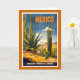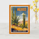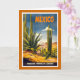 Belle affiche de voyage vintage pour le Mexique montrant le désert et les cactus et une petite ville à l'arrière-plan.