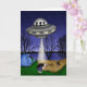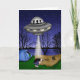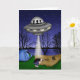 Art alien dessiné à la main. OVNI essayant d'enlever un homme campant au bord du lac dans la forêt. La carte est vide à l'intérieur, vous pouvez donc ajouter votre propre message pour en faire un anniversaire, un anniversaire ou penser à votre carte.