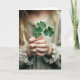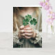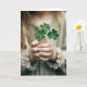 Une jeune fille aux cheveux longs tient trois branches de trèfle délicatement dans ses mains, qui sont placées devant un vêtement rouillé et de couleur claire. Le texte peut être modifié.
