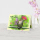 Cette carte de note présente un jeune colibri à gorge rubis qui "pense à vous", il n'a pas encore développé la coloration rubis sur sa gorge. Il est assis sur un bar en métal, prêt à plonger dans le nectar des fleurs qui l'entourent. Le arrière - plan est une palette douce et agréable de rose, rouge, or, jaune et vert. D'autres colibris sont à l'intérieur. Vous pouvez customiser le texte en fonction de vos besoins.
