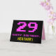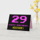 Le devant de cette carte de voeux d'anniversaire amusant, nerdy et geeky comporte un grand numéro rose "29", ainsi que le message "HAPPY BANTHDAY," en rose, et un nom de destinataire jaune gras modifiable. Le texte présente un look inspiré de celui des graphismes vidéo/jeux vidéo 8 bits vintages des années 1970 et 1980, et l'arrière - plan est en noir coloré. L'intérieur a un message de voeux d'anniversaire personnalisé, ou peut-être peut-être être effacé et laissé vide si un message doit être écrit à la main à la place. Une carte d’anniversaire personnalisée comme celle-ci pourrait être une façon amusante de célébrer le vingt-neuvième anniversaire de quelqu’un. [~Z0000478]