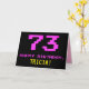 Le devant de cette carte de voeux d'anniversaire amusant, nerdy et geeky comporte un grand numéro "73" et le message "HAPPY BANTHDAY", rose coloré, avec un nom de destinataire personnalisé jaune gras. Le texte présente un aspect inspiré de celui de 8-bit de style rétro ordinateur/jeux vidéo graphiques des années 1970 et 1980, et l'arrière - plan est noir de couleur. L'intérieur comporte un message d'anniversaire personnalisé, ou pourrait être effacé et laissé vide si un message doit être écrit à la main à la place. Une carte d’anniversaire personnalisée comme celle-ci pourrait être une façon amusante de reconnaître le soixante-treizième anniversaire de quelqu’un. [~Z0000478]