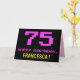 Le devant de cette carte de voeux d'anniversaire amusant, geeky et nerdy comporte un grand numéro "75" et le message "HAPPY BANTHDAY", couleur rose, avec un nom de destinataire jaune gras modifiable. Le texte a un aspect inspiré de celui des graphiques vidéo/jeux vidéo 8 bits classiques des années 1970 et 1980, et l'arrière - plan est noir de couleur. L'intérieur comporte un message de voeux d'anniversaire modifiable, ou peut-être pourrait-il être effacé et laissé vide si un message doit être écrit à la main à la place. Une carte d’anniversaire personnalisée comme celle-ci pourrait être une façon amusante d’envoyer un message célébrant le soixante-quinzième anniversaire de quelqu’un. [~Z0000478]