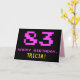 Le devant de cette carte de voeux d'anniversaire amusant, nerdy et geeky comporte un grand numéro "83" et le message "HAPPY BANTHDAY", couleur rose, avec un nom de destinataire jaunâtre personnalisable. Le texte a un look inspiré de celui de jeu vidéo vintage de style 8 bits et des graphiques de jeux informatiques des années 1970 et 1980, et l'arrière - plan est coloré noir. L'intérieur comporte un message d'anniversaire personnalisé, ou pourrait être effacé et laissé vide si un message doit être écrit à la main à la place. Une carte d’anniversaire personnalisée comme celle-ci pourrait être une façon amusante de reconnaître les quatre-vingt-trois ans de quelqu’un. [~Z0000478]