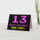 Le recto de cette carte de voeux amusante, geek et nerdy à thème d'anniversaire comporte un grand numéro rose "13", ainsi que le message "HAPPY BANTHDAY," en rose, et un nom de destinataire personnalisé jaune gras. Le texte présente une apparence inspirée de celle de jeux vidéo et de jeux vidéo de style 8 bits vintages des années 1970 et 1980, et l'arrière - plan est noir de couleur. L'intérieur comporte un message de voeux d'anniversaire customisé, ou peut-être pourrait-il être effacé et laissé vide si un message doit être écrit à la main à la place. Une carte d’anniversaire personnalisée comme celle-ci pourrait être une façon amusante de célébrer le treizième anniversaire de quelqu’un. [~Z0000478]
