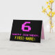 Le devant de cette carte de voeux d'anniversaire amusant, geek et nerdy comporte un grand numéro "6" et le message "HAPPY BANTHDAY", couleur rose, avec un nom de destinataire personnalisé jaune gras. Le texte a un look inspiré de celui des graphismes classiques de style 8 bits d'ordinateur/jeu vidéo des années 1970 et 1980, et l'arrière - plan est noir de couleur. L'intérieur comporte un message d'anniversaire personnalisé, ou pourrait être effacé et laissé vide si un message doit être écrit à la main à la place. Une carte d’anniversaire personnalisée comme celle-ci pourrait être une façon amusante de reconnaître le sixième anniversaire de quelqu’un. [~Z0000478]
