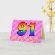 Cette carte de vœux d'anniversaire 91 ans joyeuse et festive présente un recto avec un grand nombre "91" ayant un motif coloré inspiré de l'apparence d'un spectre d'arc-en-ciel, sur un fond à motif rayé de formes de cœurs rose clair et rose foncé joyeux. Le recto comporte également le message "Joyeux 91e anniversaire," suivi du nom du destinataire personnalisé. L'intérieur comporte un message de vœux d'anniversaire modifiable, ou pourrait éventuellement être effacé et laissé vierge si un message doit être écrit à la main à la place. Une carte d'anniversaire personnalisable comme celle-ci pourrait être une façon amusante et heureuse d'envoyer un message pour célébrer le quatre-vingt-onzième anniversaire de quelqu'un. [~Z0000418]