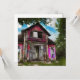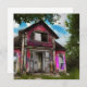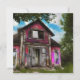 Une vétuste vétuste maison de grange abandonnée entourée d'arbres. Windows se connecte. Rouge et rose. Post apocalyptique.